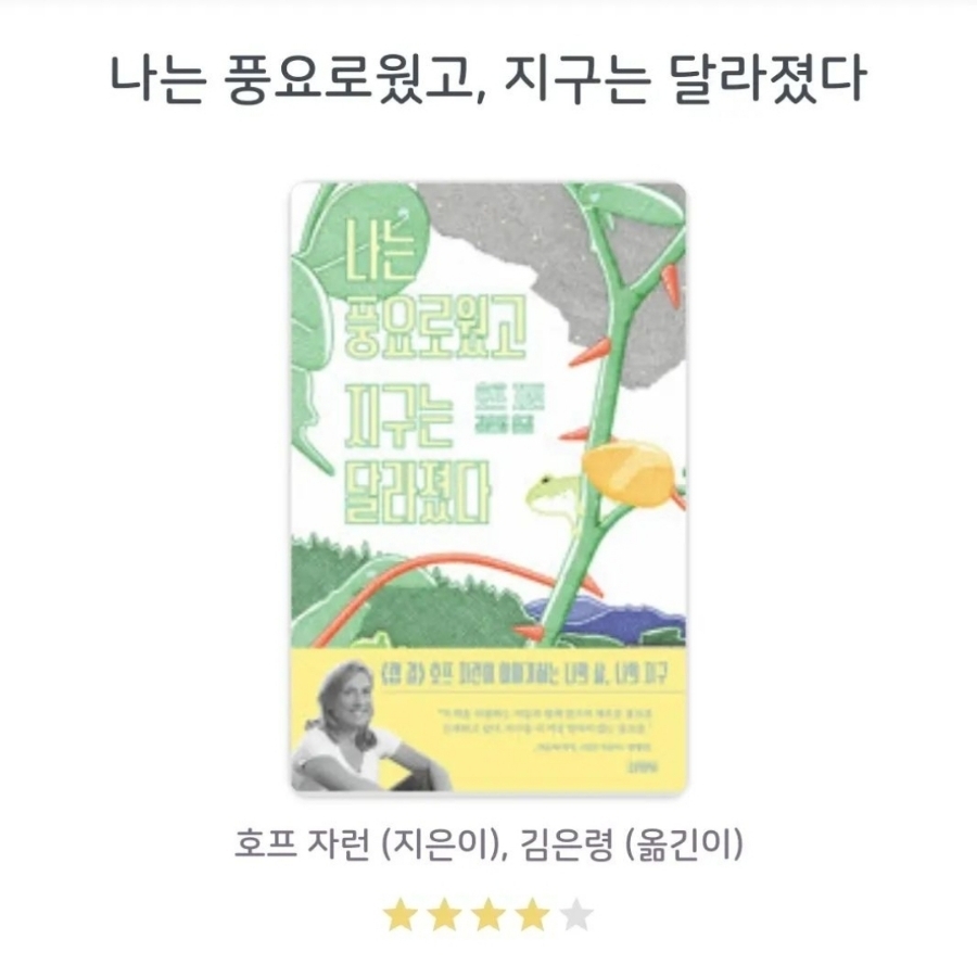 환경 관련하여 한 테마가 아니라 여러가지 테마를 다룬게 좋았다. 환경에 대해 조금 더 고민해보게 된 책이다