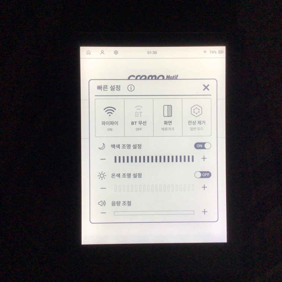 크레마S 사용했을 때는 백색조명을 반정도 켜고 봤던 것 같은데 모티프는 20-30%만 틀어도 밝더라구요!