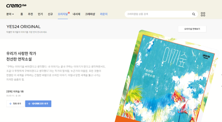 천선란 작가님 작품 좋아하는데 크레마북클럽 오리지널에 있더라구요!